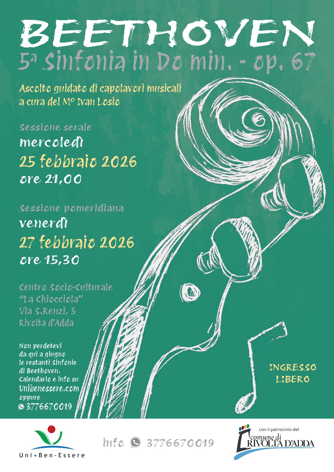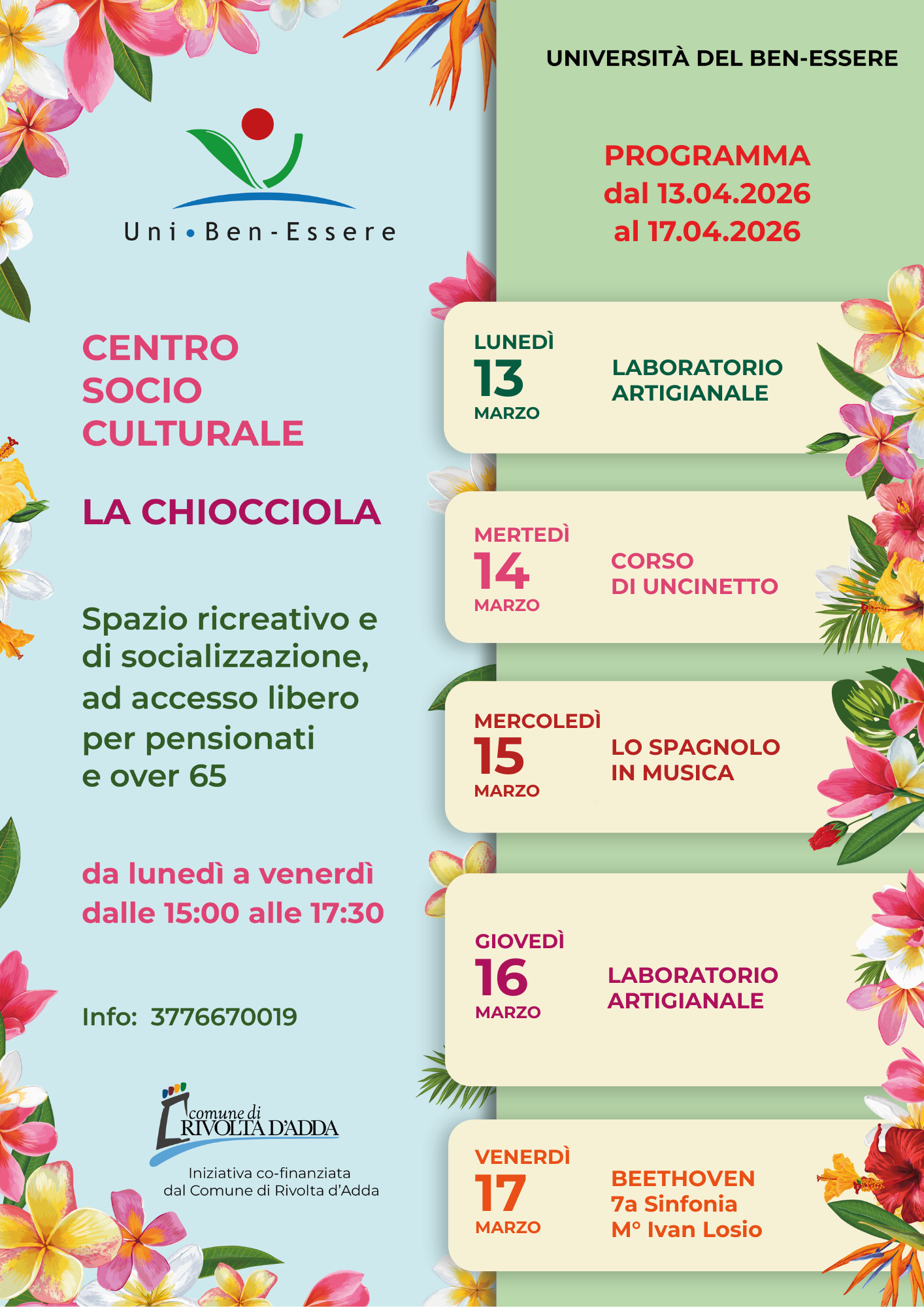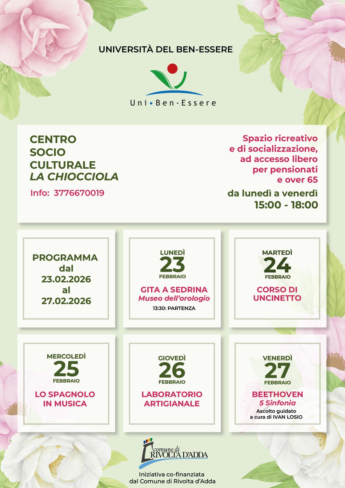 Segreteria: Da lunedì a venerdì 15.00-18.00, Centro Socio-Culturale Rivolta d’Adda, Via S. Renzi n. 1 (chiostro biblioteca comunale); altri orari su appuntamento.